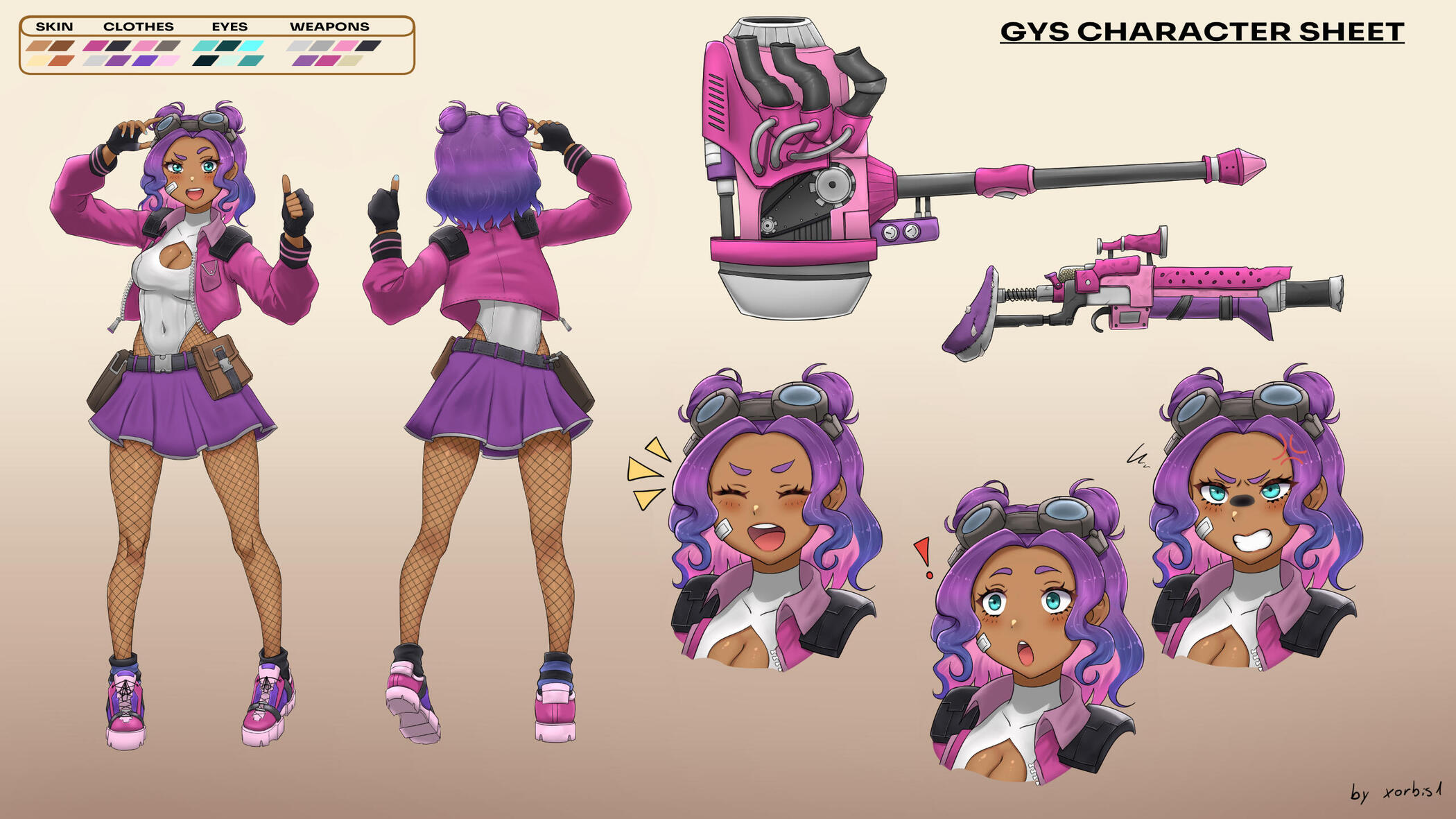 Diseño de personaje con vistas frontal, lateral y posterior, y tres expresiones faciales.